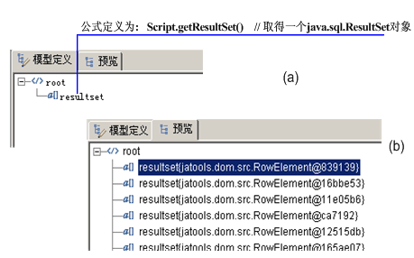 如果你有一个java.sql.ResultSet对象,那你可以定义一个数组节点,用脚本得到该对象,并将所有记录作成报表。下图所示模型中的resultset节点定义是从一个Script类的静态方法中,得到一个记录销售情况的ResultSet对象,该ResultSet对象有年份,月份,产品,金额等字段。